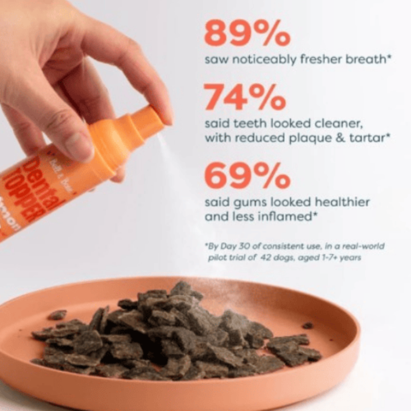 Combining oral actives and a unique powerful tribiotic blend (prebiotics, probiotics and postbiotics), the Bell & Bone Dental Topper Salmon works to fight dental disease at the root cause - the gut - by turning your pooches favourite meal into dental food. Using just four sprays daily, this meal topper reduces plaque and tartar build-up by eliminating bad bacteria in the gut microbiome, helping to improve bad breath and smelly stools after just one week of use! The Bell & Bone Dental Topper is perfect for picky eaters, and is perfect to combine with Bell & Bone Dental Sticks for the ultimate dental care solution.